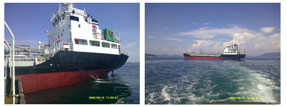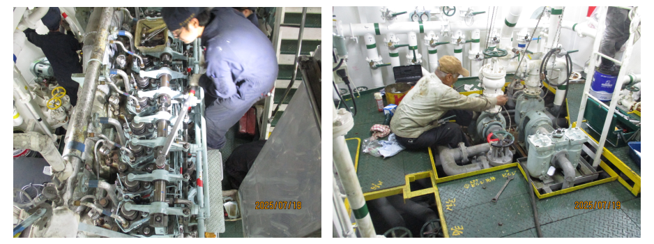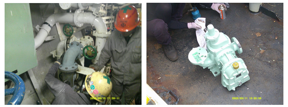 動きが悪かった荷役配管バルブを分解整備したり、カーゴポンプの作動油を交換します。念入りに試運転をして完了。これで安心して荷役が行なえます。